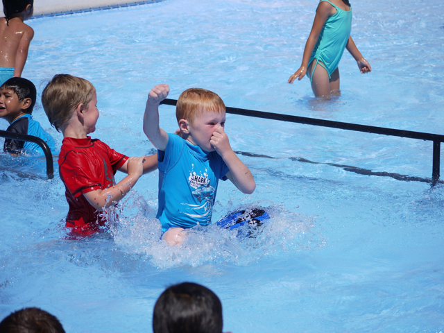 Friday is free swim Friday. It is lots of fun. We can do whatever we like. We have boards and hoops to pick up. We have to show Mrs. TB what we can do in the water. We share the pool with Room 3. We have fun with other children too.